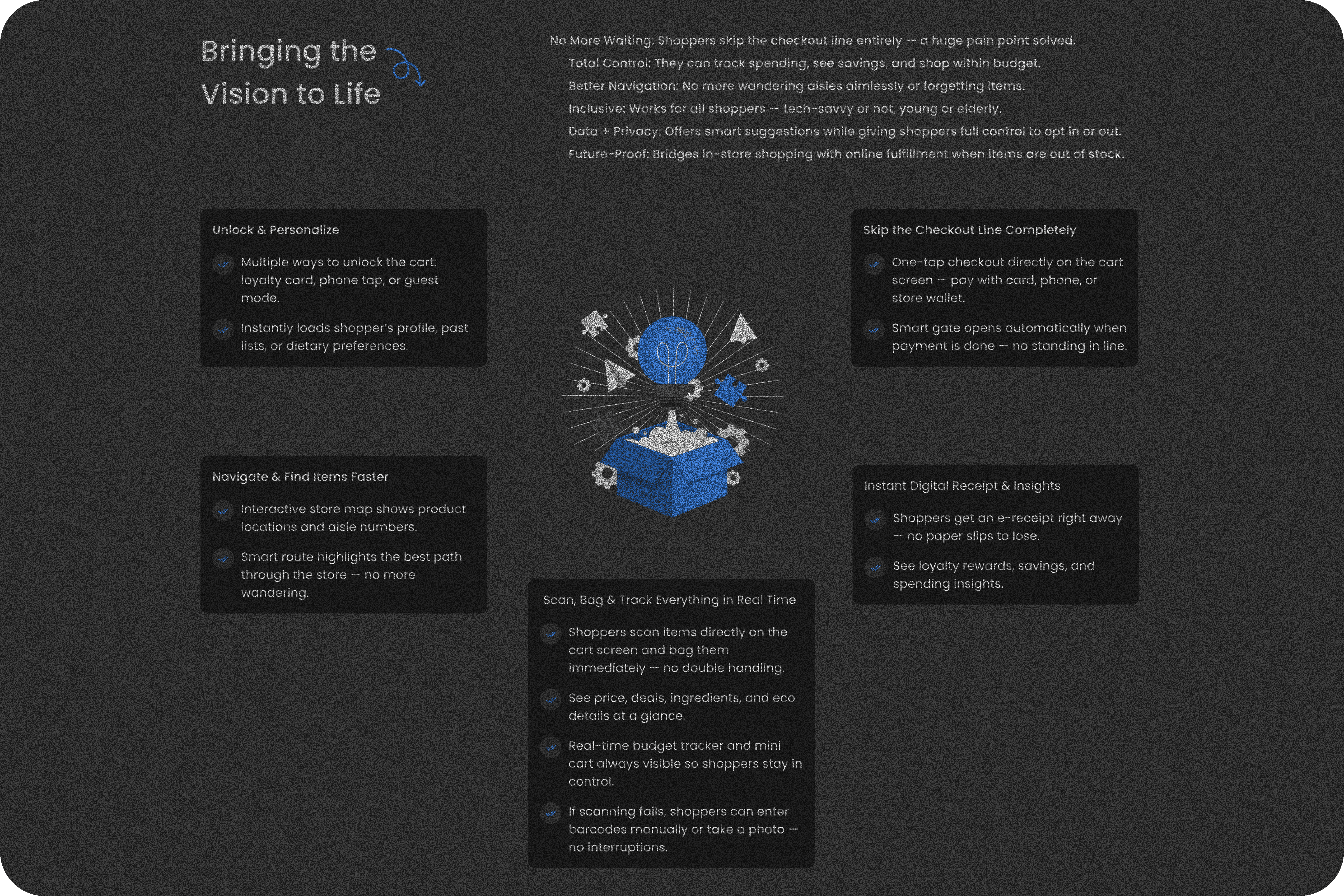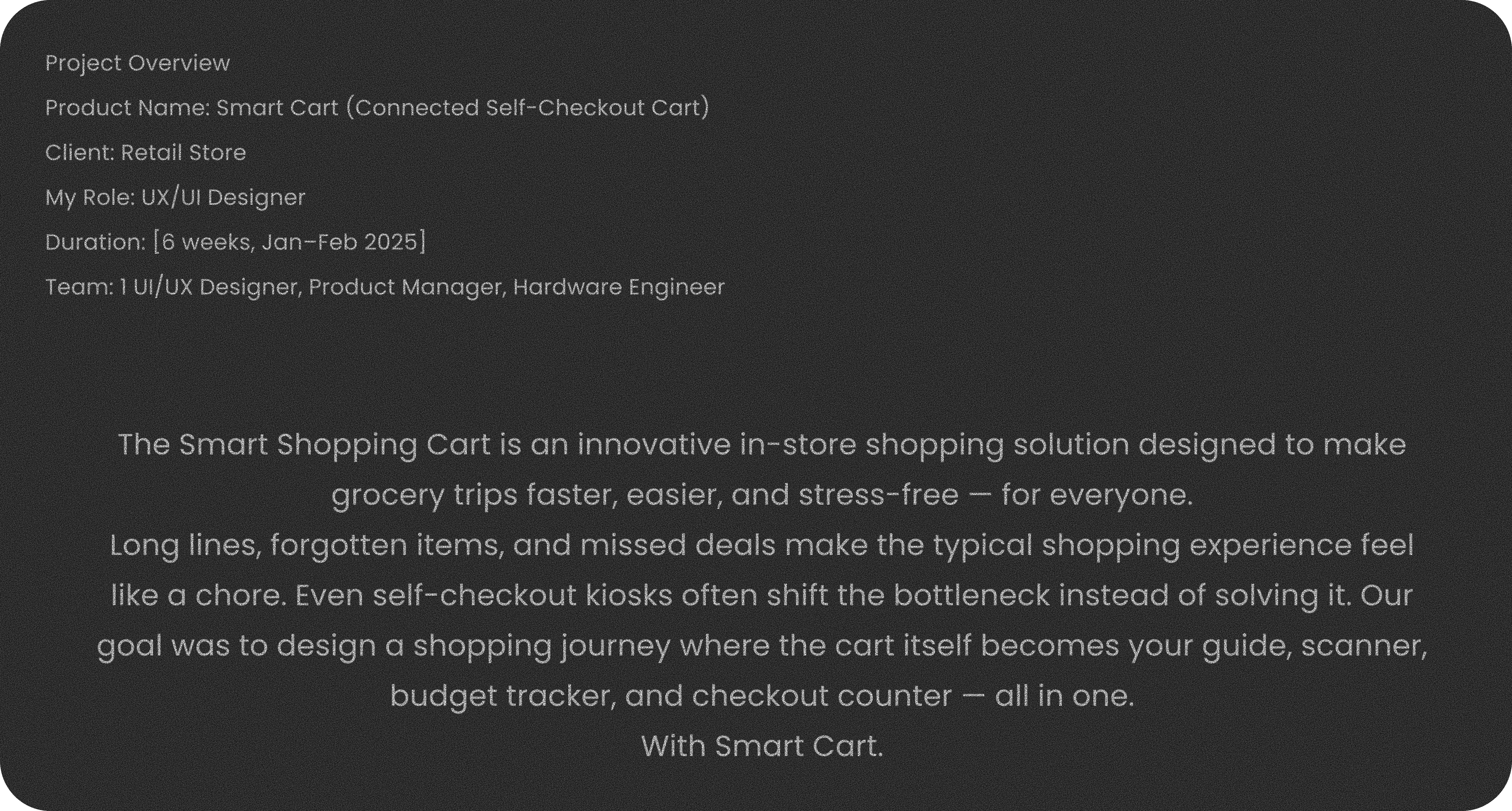 The smart shopping cart is an innovative in sotre shopping solution designed to make grocery trips faster, easier and stress free.